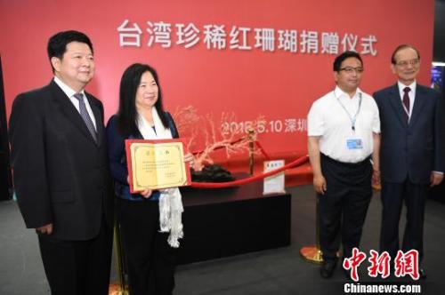 中新社深圳5月10日電 (沈釗)臺灣綺麗珊瑚有限公司董事長洪明麗10日在第十四屆深圳文博會上向北京故宮博物院和西藏布達拉宮捐贈了兩株珍貴的紅珊瑚樹,國務院臺灣事務辦公室副主任龍明彪、國民黨榮譽副主席林豐正等出席了當天捐贈儀式。