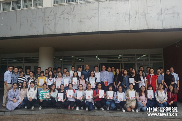 滕鴻年、張軍一行與受助四川大學學生合影留念。(圖片來源:四川省臺辦)