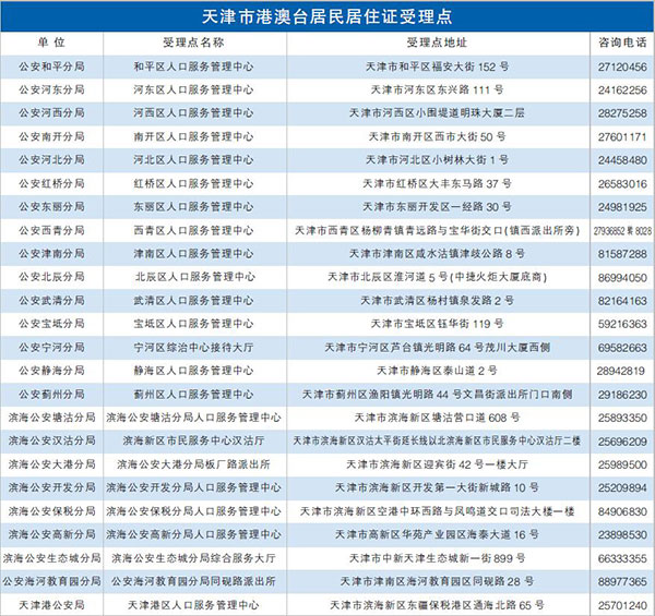 天津北方網訊:在昨日召開的在津港澳臺居民居住證申領發放辦法座談會上,我市公安機關就港澳臺居民在津申領居住證的政策進行了詳細解讀。從9月1日起,公安機關本著“就近、方便”的原則,在全市各區共設置了24個受理點,全面開展港澳臺居民居住證受理業務。