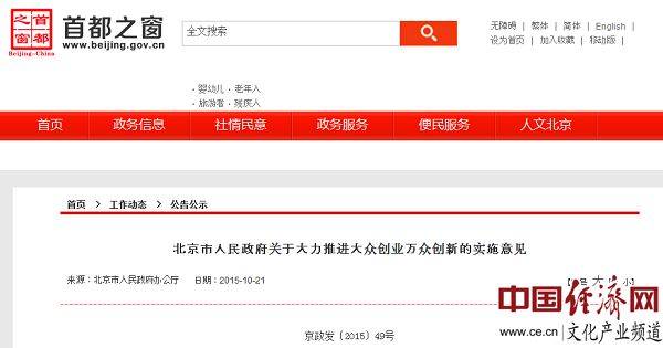 北京市人民政府關于大力推進大眾創業萬眾創新的實施意見