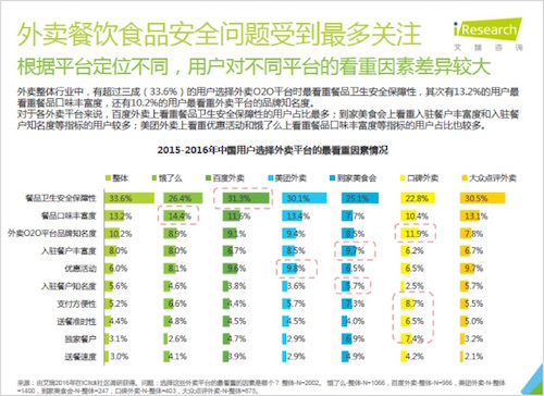 消費能力的提高通常也伴隨著對于品質要求的提高,艾瑞將每一個用戶評判品質的維度做了一個全面的統計,安全問題、口味豐富、平臺知名度等等都是用戶考量的因素。
