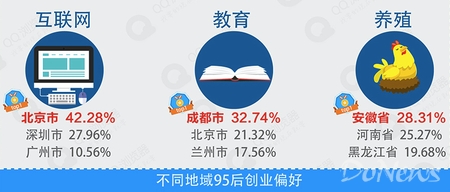 報告顯示,來自北京的95后們對互聯網的關注指數最高,天府之國的95后們對教育培訓最感興趣,而不少來自安徽、河南和東三省的95后們走上了養殖致富的道路!