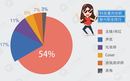 而作為跟隨互聯網發展而成長起來的一代人,95后還非常敢于嘗試由互聯網所催生的各種新鮮職業。在如今人人都能當主播的年代,95后分分鐘拿起手機做網紅,月薪10萬不是夢!報告顯示,在95后最向往的新興職業排行榜中,絕大多數人選擇了主播職業,其次排名為網紅、聲優、化妝師、coser等。