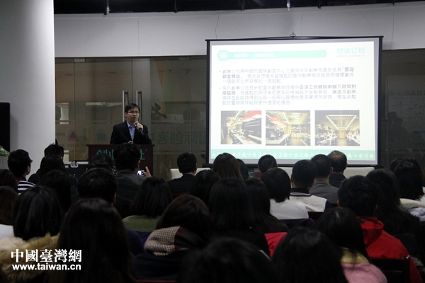 創業公社臺灣專區負責人鄭博宇向臺灣青年們介紹“臺灣創客驛站”。(中國臺灣網 吳曉寒 攝)