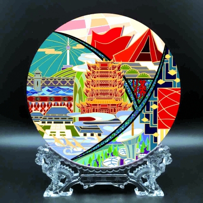 武漢地標創(chuàng)意擺件—設計風格以楚文化漆器為主導,涵蓋了武漢的歷史、文化和科技。采用類似西方教堂玻璃彩色花窗的設色與構圖。不僅有楚文明對盤面設計的影響和象征歷史的黃鶴樓、辛亥革命紀念館,也加入了標志著武漢蓬勃發(fā)展的馬蹄蓮和造型別致的漢秀劇院等現(xiàn)代新興元素。