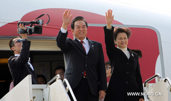 Chen Yunlin (C), president of Chinese mainland's Association for Relations Across the Taiwan Strait (ARATS), bids farewell at the Taoyuan International Airport in Taipei, southeast China's Taiwan, Dec. 22, 2010. Chen and his delegation left here Wednesday for the Chinese capital of Beijing after the conclusion of the sixth round of cross-strait talks. (Xinhua/Song Lidong)