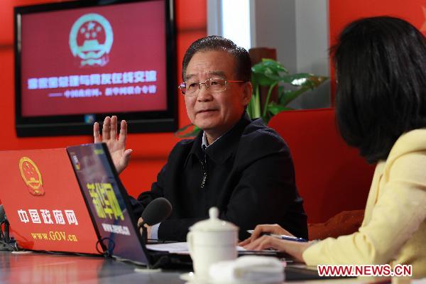 Chinese Premier Wen Jiabao (L) holds an online chat with Internet users at two state news portals in Beijing, capital of China, Feb. 27, 2011. The two portals, namely www.gov.cn of the central government and www.xinhuanet.com of the Xinhua News Agency, jointly interviewed Premier Wen on Sunday with questions raised by netizens. (Xinhua/Pang Xinglei)