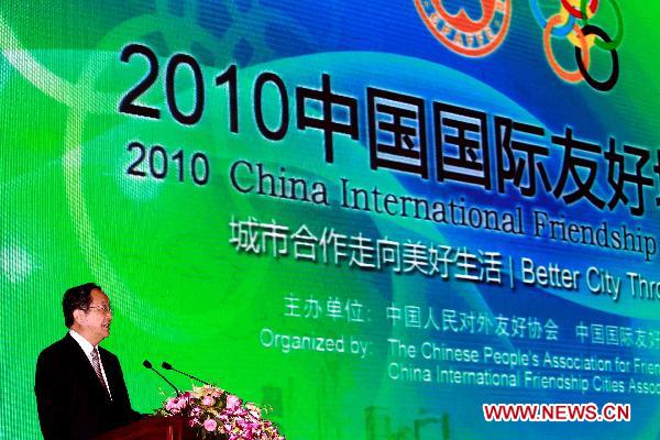 Yu Zhengsheng, a member of the Political Bureau of the Communist Party of China (CPC) Central Committee and secretary of the CPC Shanghai Municipal Committee, addresses 2010 China International Friendship Cities Conference held in Shanghai, east China, on Sept. 8, 2010. (Xinhua/Zhang Ming) |