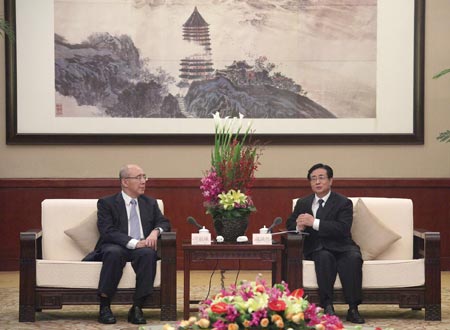 Zhao Hongzhu (R), secretary of the Zhejiang Provincial Committee of the Communist Party of China, meets with Kuomintang Chairman Wu Poh-hsiung in Hangzhou, capital of east China's Zhejiang Province, on May 29, 2009. (Xinhua/Xing Guangli)