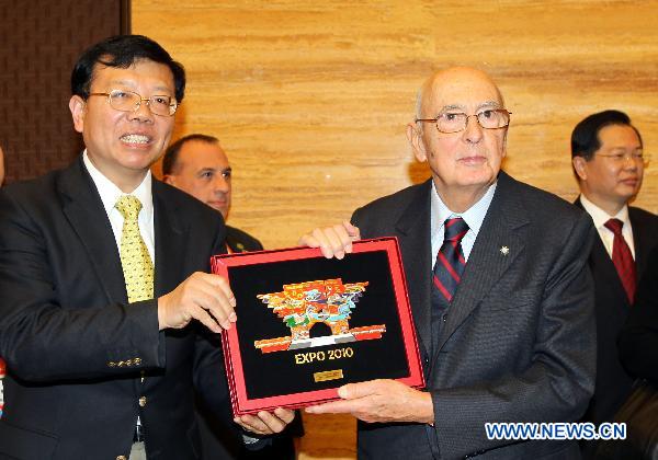Italian President Giorgio Napolitano (R front) holds a gift presented by China Pavilion at the 2010 Shanghai World Expo in Shanghai, east China, Oct. 28, 2010. Napolitano visited the Shanghai World Expo park on Thursday. (Xinhua/Fan Jun)