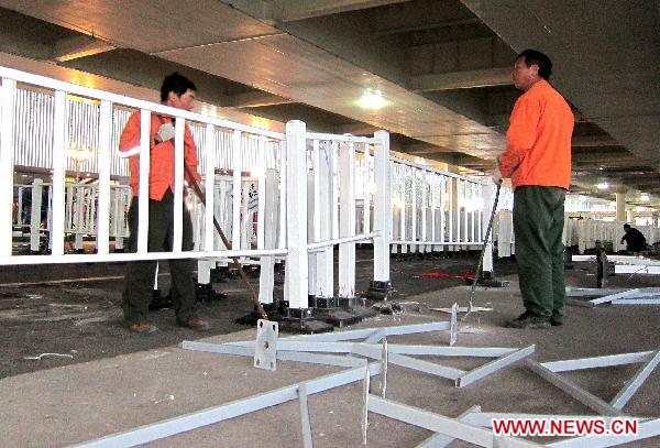 Workers remove railings in the World Expo Park in Shanghai, east China, Nov. 1, 2010. The World Expo closed on Oct. 31, 2010. (Xinhua/Chen Fei)