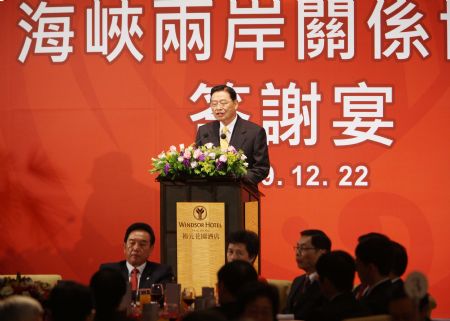 Chen Yunlin, president of the Chinese mainland's Association for Relations Across the Taiwan Straits (ARATS), speaks during the banquet held by ARATS, in Taichung of southeast China's Taiwan, Dec. 22, 2009. The ARATS held the banquet to express its thanks to the Taiwan-based Straits Exchange Foundation (SEF) and the people who had worked for the talks between the two organizations. (Xinhua/Yuan Man)