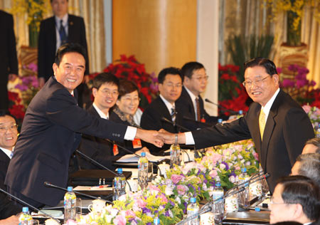 President of the Chinese mainland's Association for Relations Across the Taiwan Straits (ARATS) Chen Yunlin (L) shakes hands with Chairman of Taiwan's Straits Exchange Foundation (SEF) Chiang Pin-kung before their talks in Taichung, Dec. 22, 2009. ARATS President Chen Yunlin and SEF Chairman Chiang Pin-kung met for the fourth round of talks since the two sides of the Taiwan Strait resumed negotiations in June last year following a 10-year suspension. (Xinhua Photo)