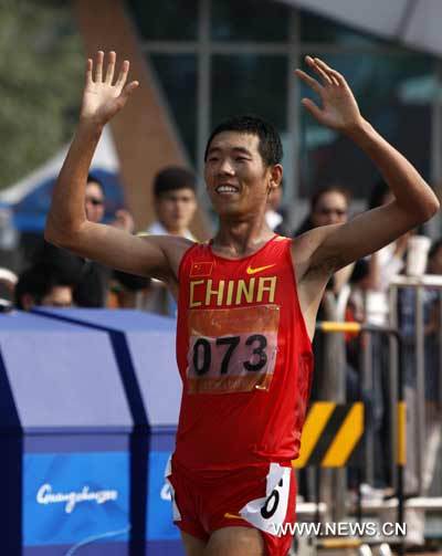 China's Wang Hao celebrates his victory in the men's 20km race walking final of Athletics at the 16th Asian Games in Guangzhou, south China's Guangdong Province, Nov. 21, 2010. Wang Hao won the gold medal in a time of 1 hour, 20 minutes and 50 seconds. (Xinhua/Wang Lili)