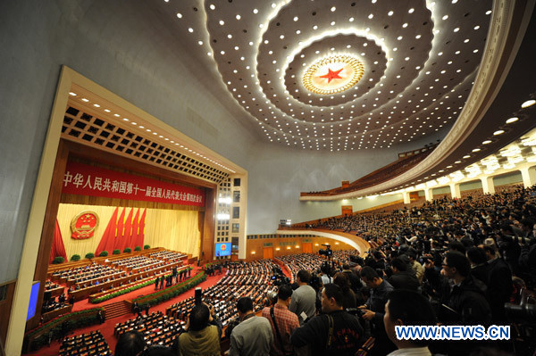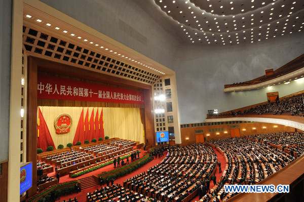 The Fourth Session of the 11th National People's Congress holds its closing meeting at the Great Hall of the People in Beijing, China, March 14, 2011. (Xinhua/Yang Zongyou)