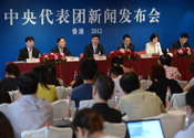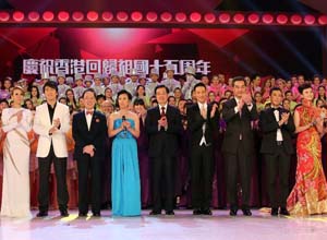Chinese President Hu Jintao (C, front) sings the song "Ode to the Motherland" with performers during an evening gala celebrating the 15th anniversary of Hong Kong's return to the motherland in Hong Kong, south China, June 30, 2012.