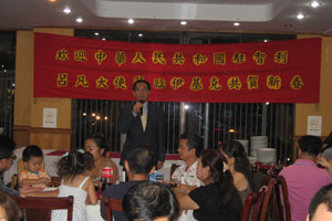 9日晚, 旅居伊基克的華商、華僑、華人、臺灣同胞以及中資公司代表等160多人出席了歡迎新大使、共度新春佳節聚餐會。呂大使在會上發表講話,簡要介紹了國內政治穩定、經濟發展的大好形勢,對旅居伊基克的僑胞、臺胞等多年來為支持國內建設,特別是在祖國南方發生冰凍雪災和汶川發生強烈地震后踴躍捐款、慷慨解囊的無私奉獻精神,以及為促進中智友好關系發展所做的努力和貢獻表示衷心的感謝。希望大家繼續和衷共濟,為國家的經濟發展和祖國的和平統一做出自己的努力。祝全體僑胞在新的一年里生意興隆,事業發達。