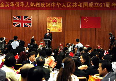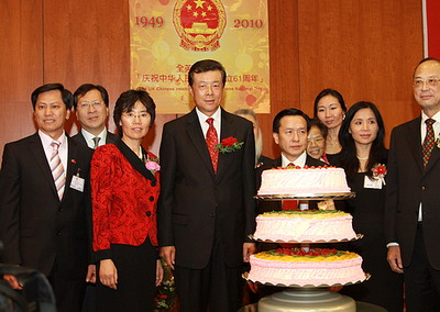 2010年9月14日,全英華僑華人慶祝中華人民共和國成立61周年晚會在倫敦IBIS酒店隆重舉行。劉曉明大使夫婦應(yīng)邀出席,與全英僑界450多位代表歡聚一堂,共慶祖國華誕和中秋佳節(jié)。秦剛公使、張建國武官、陸旭參贊等陪同。