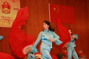 晚會上,僑領(lǐng)們陪同劉大使夫婦一道切祖國生日蛋糕,共唱《歌唱祖國》。華人文藝團(tuán)體還準(zhǔn)備了豐富多彩的文藝表演。頗具中國傳統(tǒng)色彩的民族舞蹈、少林功夫等節(jié)目,給晚會增添了歡樂、喜慶的氣氛。