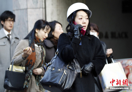 日本近海3月11日發生了強烈地震,首都東京震感強烈。日本氣象廳隨即發布了海嘯警報,稱地震將引發約6米高海嘯。圖為東京市金融區一女子從建筑物內疏散后頭戴安全帽在打電話。
