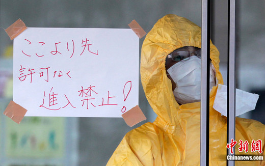 日本首相菅直人周一(14日)表示,在大地震和海嘯中受損的核電站仍然處于“警戒”狀態。東京電力公司周一向政府報告說,福島第一核電站輻射程度再次超過法定劑量。福島縣第一核電站在地震發生后已經關閉,但是因反應堆冷卻系統發生故障導致輻射超標。圖為在福島縣二本松,民眾隔離接受輻射檢測。
