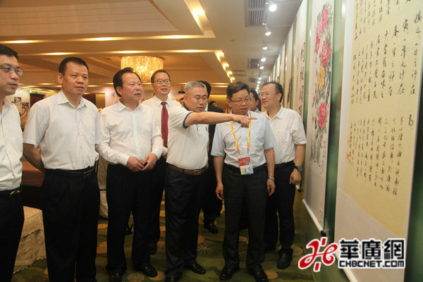 參加第八屆海峽論壇“同名村 心連心”聯誼活動開幕式的嘉賓參觀中華情 兩岸緣同名(同宗)村書畫作品展。 (華廣網吳勇攝)