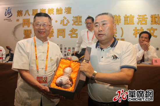 臺灣閩臺同宗同名村交流中心主任陸炳文向本次大陸主辦方中國華藝廣播公司總經理艾克贈送信物“德化瓷葫蘆形猴面粥米罐”。 (華廣網吳勇攝)