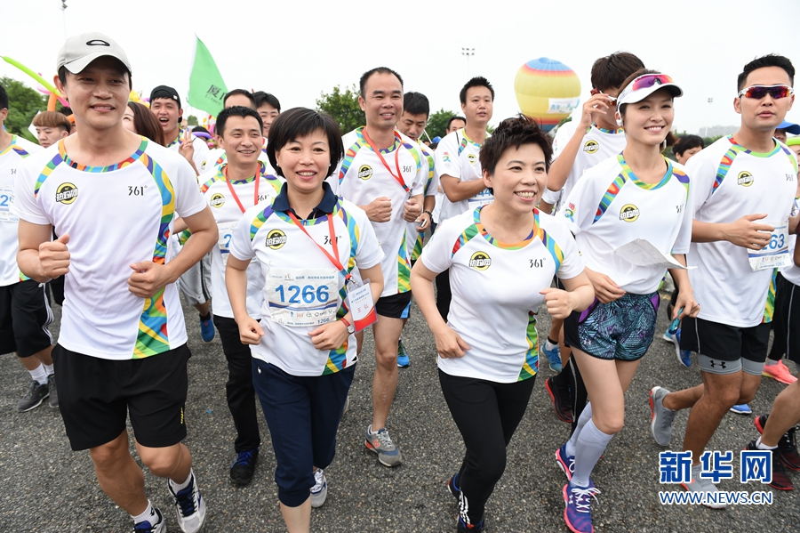 6月13日,奧運(yùn)乒乓球冠軍鄧亞萍(右三)、來(lái)自臺(tái)灣的雅典奧運(yùn)會(huì)跆拳道亞軍黃志雄(左一)與健跑者一起奔跑。