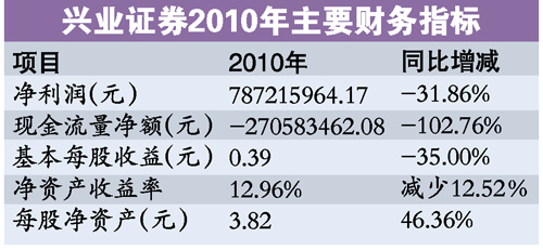 由于這是興業(yè)證券上市后的首份年報,各項指標明顯走低也顯得頗為尷尬。該公司的解釋稱,公司經(jīng)營業(yè)績下降,主要是由于受市場環(huán)境變化和證券行業(yè)競爭加劇、傭金費率快速下跌的影響,收入同比下降,但成本支出存在剛性,成本費用同比略有上升所致。2010 年證券市場震蕩下跌,公司自營業(yè)務(wù)收入和利潤同比大幅減少;同時,受新設(shè)營業(yè)部快速增加的影響,傳統(tǒng)經(jīng)紀業(yè)務(wù)競爭慘烈,股票基金交易傭金費率快速下降,出現(xiàn)增量不增收的窘境。