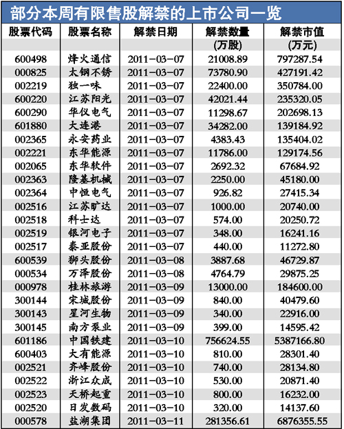 從個股的解禁市值來看,鹽湖集團位居首位。數據顯示,該公司的28.14億股的限售股將于3月11日解禁。如果按照該公司停牌前的24.44元的價格計算,解禁市值達到688億元。中國鐵建緊隨其后,該公司75.66億股有限售條件的股票3月10日出籠,解禁市值達到539億元,兩者合計解禁市值達到1227億元,占下周總解禁市值的80%。