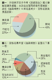 調查發現,近半受訪者認同新年度施政報告應以經濟發展為重點,而在具體政策范疇方面,“民生福利”居首,其中最多受訪者希望報告能“改善失業問題”,占36%;其次為“加強打擊青少年吸毒”,占22%;再次是“增加對低收入家庭的支持”,占12%。
