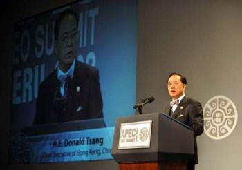 將于下月出席亞太經合會議的曾蔭權表示,會就規管評級公司、對沖基金等提出意見。圖為曾蔭權去年在同一會議上發表演說。(圖片來源:大公報)