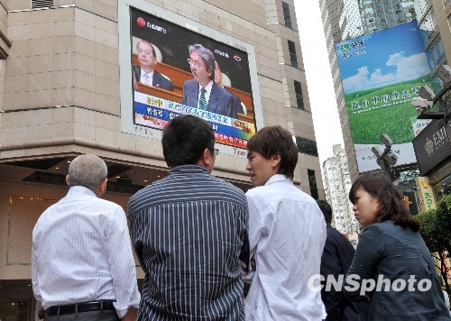 2月24日,香港財政司司長曾俊華在立法會宣讀2010至2011年度財政預(yù)算案。不少市民駐足在時代廣場大型電視前觀看直播情況。 中新社發(fā) 鄧慶樂 攝