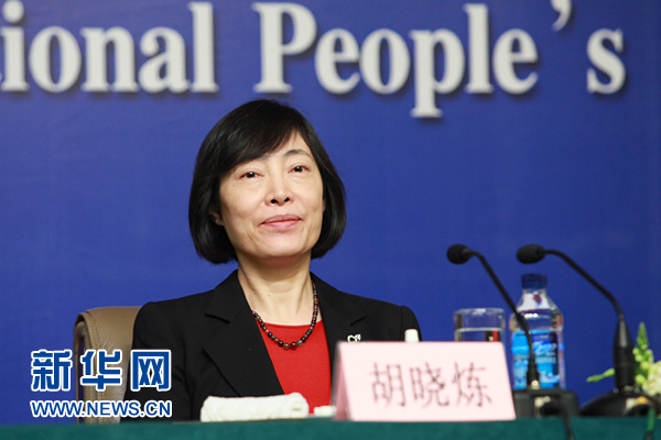 2011年3月11日10:45,十一屆全國人大四次會議新聞中心在梅地亞舉行主題為“貨幣政策及金融問題”記者會。人民銀行行長周小川、人民銀行副行長胡曉煉、人民銀行副行長劉士余、人民銀行副行長兼國家外匯管理局局長易綱出席記者會接受媒體采訪。圖為中國人民銀行副行長胡曉煉。新華網(wǎng) 吳莼攝
