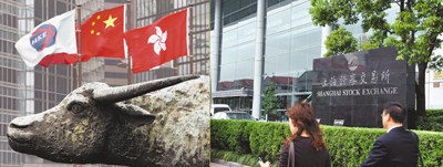 左圖為香港港交所外的銅牛像,右圖為上海上交所。 資料圖片