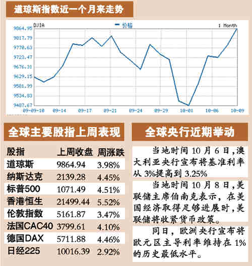 上周全球股市大幅上漲,主要股指平均漲幅超過4%。紐約三大股指上周五收盤小幅上漲,道指收于9864.94點,創一年來新高,離萬元大關僅一步之遙。香港恒指上周漲1123.95點,漲幅達5.52%。