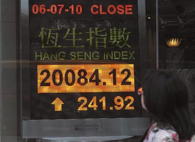 7月6日,市民從香港灣仔一家銀行的恒生指數電子顯示屏前走過。當日,香港恒生指數上漲241.92點,重上20000點,收報20084.12點。 新華社記者 黃本強攝