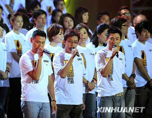 8月17日,在香港舉行的賑災(zāi)義演中,香港藝人張學(xué)友(前左)、譚詠麟(前中)和劉德華(前右)演唱《一點(diǎn)燭光》。當(dāng)日,香港及海峽兩岸藝人在位于香港的亞洲國際博覽館舉行賑災(zāi)義演,為受到臺風(fēng)“莫拉克”影響的臺灣民眾籌款。新華社記者陳鐸攝
