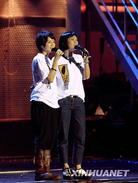 8月17日,在香港舉行的賑災(zāi)義演中,香港藝人李心潔(左)和臺灣藝人張艾嘉演唱《愛的代價(jià)》。新華社記者陳鐸攝