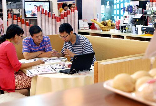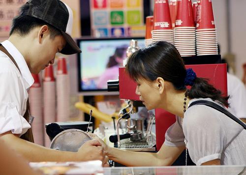 8月23日,一家從事烘焙和咖啡連鎖經營的臺灣展商在與客戶洽談。當日,“兩岸企業家論壇上海合作論壇暨兩岸連鎖加盟品牌展”在上海光大會展中心開幕。參展的兩岸企業以中小企業為主,涉及食品加工、餐飲服務、教育培訓、休閑娛樂、房地產等行業。近百位兩岸企業家“零距離”對接,共同探討金融危機下產業發展趨勢與潛在商機,并尋求合作機會。新華社記者 劉穎 攝