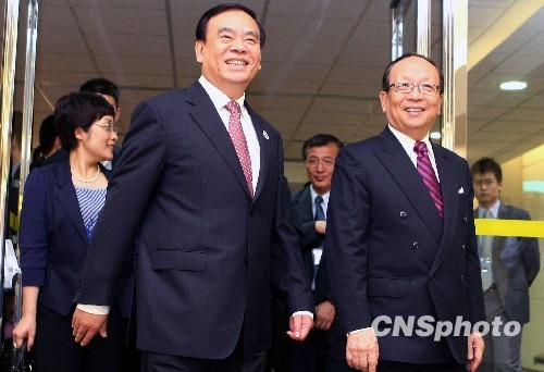 6月9日,浙江省長(zhǎng)呂祖善(左)率浙江省代表團(tuán)抵達(dá)臺(tái)灣,中國(guó)國(guó)民黨副主席蔣孝嚴(yán)(右)等到桃園機(jī)場(chǎng)迎接。浙江省代表團(tuán)此行以“探親會(huì)友、交流合作”為主題,將舉辦系列浙臺(tái)經(jīng)貿(mào)文化交流合作活動(dòng),并到社區(qū)、鄉(xiāng)村、企業(yè)、學(xué)校參觀學(xué)習(xí)。 中新社發(fā) 宋吉河 攝