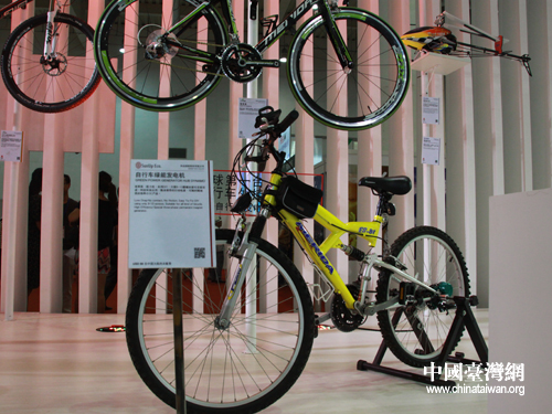 自行車綠能發電機,可將電力儲存到行動電源,供應手機、ipad等小3C充電使用。(中國臺灣網 宿靜 攝)