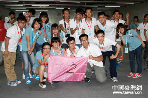 “2013年海峽兩岸紅十字青少年夏令營”營員們按大陸、臺灣學生各一半分成四個小組,分別取名為“鳳梨鴨”、“V2隊”、“心海連”和“心綠隊”。 圖為“V2隊”隊員們合影。(中國臺灣網 郜利敏 攝)