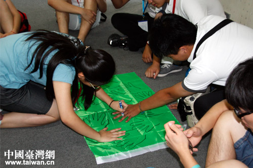 “2013年海峽兩岸紅十字青少年夏令營”營員們按大陸、臺灣學生各一半分成四個小組,分別取名為“鳳梨鴨”、“V2隊”、“心海連”和“心綠隊”。“心綠隊”營員們繪制隊旗。(中國臺灣網 郜利敏 攝)