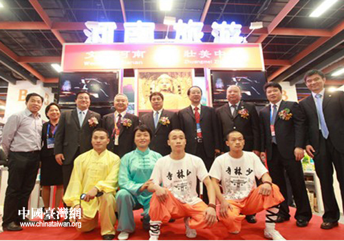 中國臺灣網11月18日鄭州消息 日前,河南省鄭州市旅游局黨組書記龍同勝帶領黃河風景名勝區、中原國旅、中州國旅等旅游企事業單位負責人及少林武僧文武學校武術隊赴臺北市,參加第六屆海峽兩岸臺北旅展。