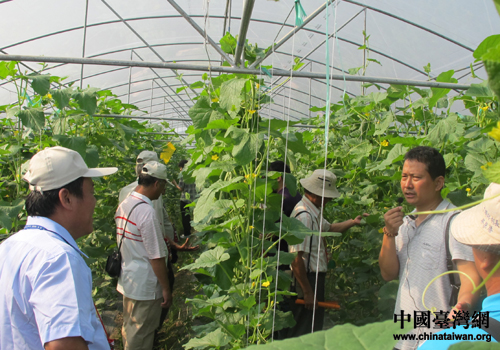 考察團一行在東興鎮(zhèn)松柏村參觀大棚蔬菜基地,松柏村菜農在向臺灣客人講解。(圖片來源:防城港市臺辦)