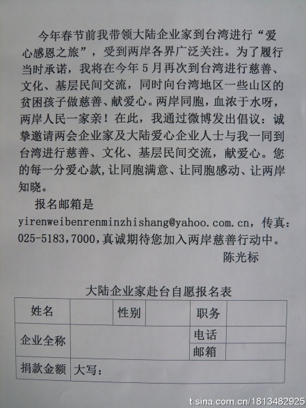 最后,陳光標(biāo)提供了供企業(yè)家報名的郵箱和傳真,并另附一張報名表格式。他表示真誠期待企業(yè)家加入兩岸慈善行動中。(中國臺灣網(wǎng) 馮存健)