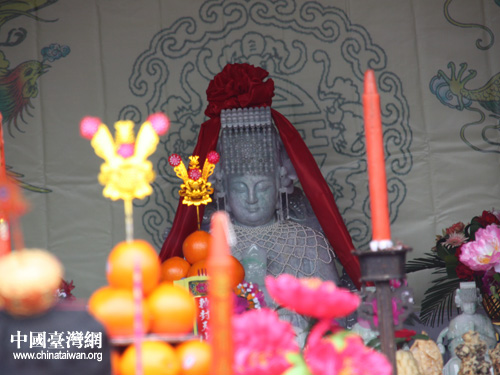 10日下午,湄洲媽祖祖廟受贈翡翠媽祖像儀式,在莆田市湄洲島天后廣場舉行,圖為開光典禮前的翡翠媽祖像。(中國臺灣網 楊麗 攝)