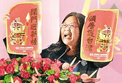 在“2010大陸臺商春節聯誼活動”中,“陸委會主委”賴幸媛高舉著“開門迎新福,顧厝護臺灣”的春聯表示要送給臺商。圖片來源:中國時報