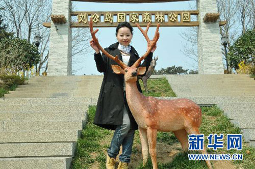 4月14日,一位媒體記者在劉公島國家森林公園門前與梅花鹿雕塑合影。 臺灣梅花鹿“繁星”“點(diǎn)點(diǎn)”和長鬃山羊“喜羊羊”“樂羊羊”將于4月16日正式入住威海劉公島國家森林公園。 新華社記者 鄧衛(wèi)華 攝